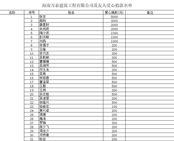 1月28日,我們?cè)诤D先f(wàn)泰建筑公眾號(hào)發(fā)布了海南萬(wàn)泰公司張小龍總經(jīng)理和??谑欣夏耆烁@喉?xiàng)目負(fù)責(zé)人林莉共同出資5萬(wàn)元購(gòu)買5000個(gè)N95口罩及飛利浦G31E病人監(jiān)護(hù)儀1套捐贈(zèng)給武穴市及張小龍總經(jīng)理組織同胞募捐的文章《心系荊楚,共渡難關(guān),這場(chǎng)戰(zhàn)“疫”,海南萬(wàn)泰在行動(dòng)!》,在公司引起了極大反響,大家主動(dòng)問(wèn)詢?nèi)绾尉杩顬楹币咔楸M一份力,大家的一腔熱血和愛(ài)心令人動(dòng)容,由此,我們迅速成立萬(wàn)泰籌募組,在公司內(nèi)部展開(kāi)了愛(ài)心捐款。愛(ài)心捐款行動(dòng)一呼百應(yīng),在短短不到兩天的時(shí)間里,萬(wàn)泰募捐組就收到了來(lái)自公司員工,萬(wàn)泰各地項(xiàng)目部及公司的合作友人的支持。截止目前,萬(wàn)泰籌募組已籌得284380元的善款!這些善款,我們已全部捐贈(zèng)給武穴市梅川鎮(zhèn)政府用于抗擊湖北疫情。捐款情況已向海南省湖北商會(huì),武穴市工商聯(lián),武穴市統(tǒng)戰(zhàn)部匯報(bào)。后續(xù)我們將跟蹤款項(xiàng)用途。