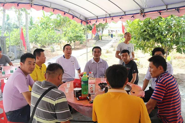 萬泰員工與當?shù)卮迕衤?lián)餐,氣氛融洽歡樂。就餐完畢后,在萬泉河文化研究會莫會長的帶領下,前往內(nèi)園村的“紅色娘子軍成立會址”參觀學習。