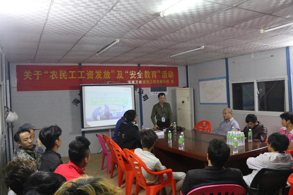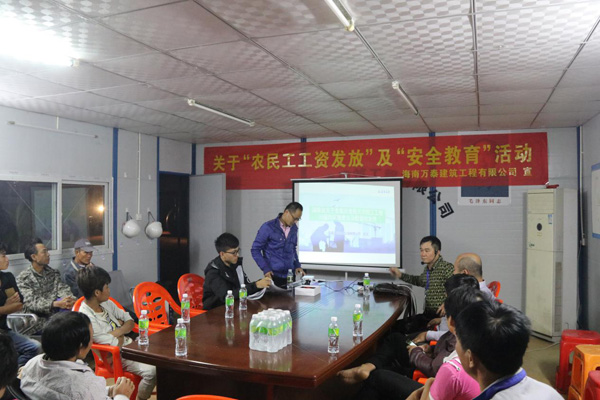 為做好年底農(nóng)民工工資正常發(fā)放事宜,落實(shí)工地安全文明管理,12月20日晚,海南萬(wàn)泰組織相關(guān)人員深入??谑校捞m區(qū))示范性綜合實(shí)踐基地項(xiàng)目,開(kāi)展農(nóng)民工資發(fā)放及安全教育培訓(xùn)。