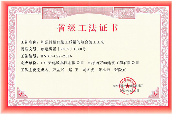 2017年12月5日,海南省住房和城鄉(xiāng)建設(shè)廳發(fā)布公告,公布了2016年度海南省省級工法名單。海南萬泰建筑工程有限公司申報的兩項工法(定型化電梯井操作平臺提升架施工工法、加強斜屋面施工質(zhì)量的組合施工工法)名列榜單,且得票數(shù)均為13票,得票率百分之百。