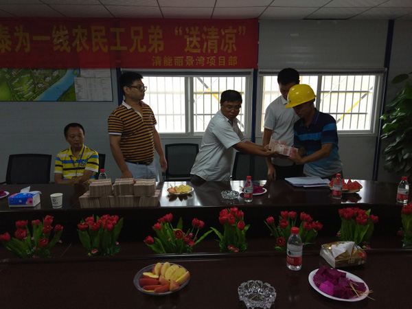 海南萬泰建筑工程有限公司五指山清能·麗景灣一期一標(biāo)項目部在會議室組織農(nóng)民工工資集體發(fā)放暨海南萬泰建筑工程有限公司“送清涼”活動。此次共計發(fā)放農(nóng)民工工資150余萬元現(xiàn)金。共送去夏季防暑涼茶50箱、綠豆300斤、冰糖150斤等一批物質(zhì)。