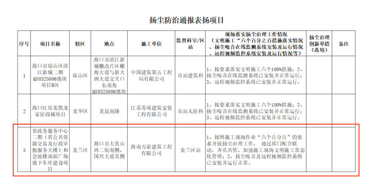根據(jù)《2021年大氣治理沖刺階段管控措施清單》,??谑凶〗ň謱κ鼙O(jiān)在建項目工地進行打分考核,列出第一批紅黑榜,對在揚塵防治方面表現(xiàn)突出的前3名受監(jiān)在建項目工地記入??谑薪ㄖさ負P塵治理“紅榜”,對排名在后5名的受監(jiān)在建項目工地記入??谑薪ㄖさ負P塵治理“黑榜”。海南萬泰承建的省政務(wù)中心二期(省公共資源交易及行政審批服務(wù)大樓)和會展樓南面廣場地下車庫建設(shè)項目因按照施工現(xiàn)場作業(yè)“六個百分百”的要求開展揚塵治理工作,通過部門配合聯(lián)動,齊抓共管,加強施工現(xiàn)場文明施工常態(tài)化管理,且揚塵噪音及遠程視頻監(jiān)控系統(tǒng)均以安裝并運行正常等,榮登??谑薪ㄖさ負P塵治理“紅榜”。