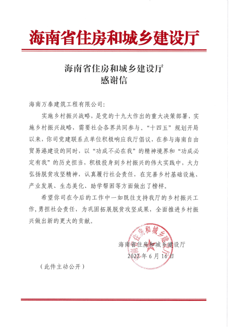 盛夏六月,喜事連連。在海南萬泰建筑工程有限公司成立十一周年之際,公司喜獲海南省住房和城鄉(xiāng)建設(shè)廳的感謝信,信中表彰了萬泰公司響應(yīng)省住建廳倡議,積極投身到鄉(xiāng)村振興事業(yè),大力弘揚(yáng)脫貧攻堅精神,認(rèn)真履行社會責(zé)任,在完善鄉(xiāng)村基礎(chǔ)設(shè)施、產(chǎn)業(yè)發(fā)展、生態(tài)美化、助學(xué)幫困等方面做出了榜樣。