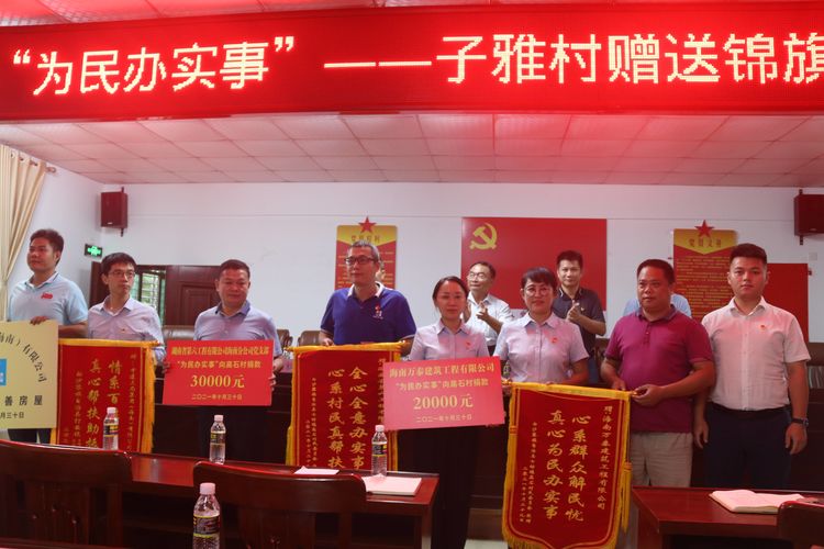 海南萬泰建筑工程有限公司自成立以來就堅定不移聽黨話、感黨恩、跟黨走,通過開展黨課、為民辦實(shí)事、主題教育活動等形式,學(xué)以正心、學(xué)以致用、學(xué)以創(chuàng)新。近些年,在省住建廳的指導(dǎo)和幫助下,在企業(yè)不斷發(fā)展壯大的同時,不忘承擔(dān)社會責(zé)任,積極響應(yīng)省廳關(guān)于鄉(xiāng)村振興、鞏固脫貧攻堅等公益民生事業(yè)的號召,慷慨解囊,為民辦實(shí)事,為白沙縣爾信村、高石村、打安村等多個幫扶村捐款捐物,修筑了民心漫水橋、便民路、村民文化廣場路燈及牛棚改造等項(xiàng)目,以一己綿薄奉獻(xiàn)之力,倡導(dǎo)社會和諧大愛。