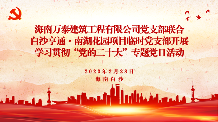 春暖花開,萬物可期。為學(xué)習(xí)貫徹落實(shí)黨的二十大會議精神,將黨建工作與業(yè)務(wù)工作有機(jī)結(jié)合,發(fā)揮基層黨組織戰(zhàn)斗堡壘的作用,在海南省質(zhì)安局的關(guān)心指導(dǎo)下,2023年2月28日,海南萬泰公司黨支部、工程部有關(guān)負(fù)責(zé)同志到項(xiàng)目部現(xiàn)場為白沙亨通·南湖花園項(xiàng)目黨建聯(lián)建共創(chuàng)基地舉行揭牌儀式,并聯(lián)合項(xiàng)目臨時(shí)黨支部開展了學(xué)習(xí)貫徹“黨的二十大”專題黨日活動,同時(shí),對項(xiàng)目工地的塔吊等重型機(jī)械進(jìn)行了安全檢查。