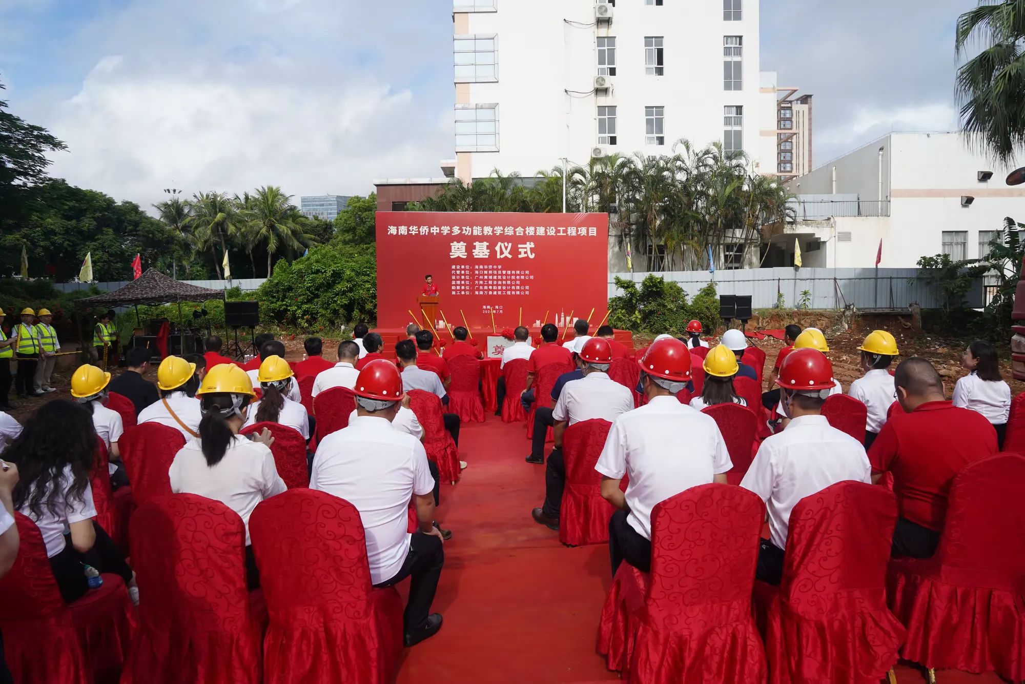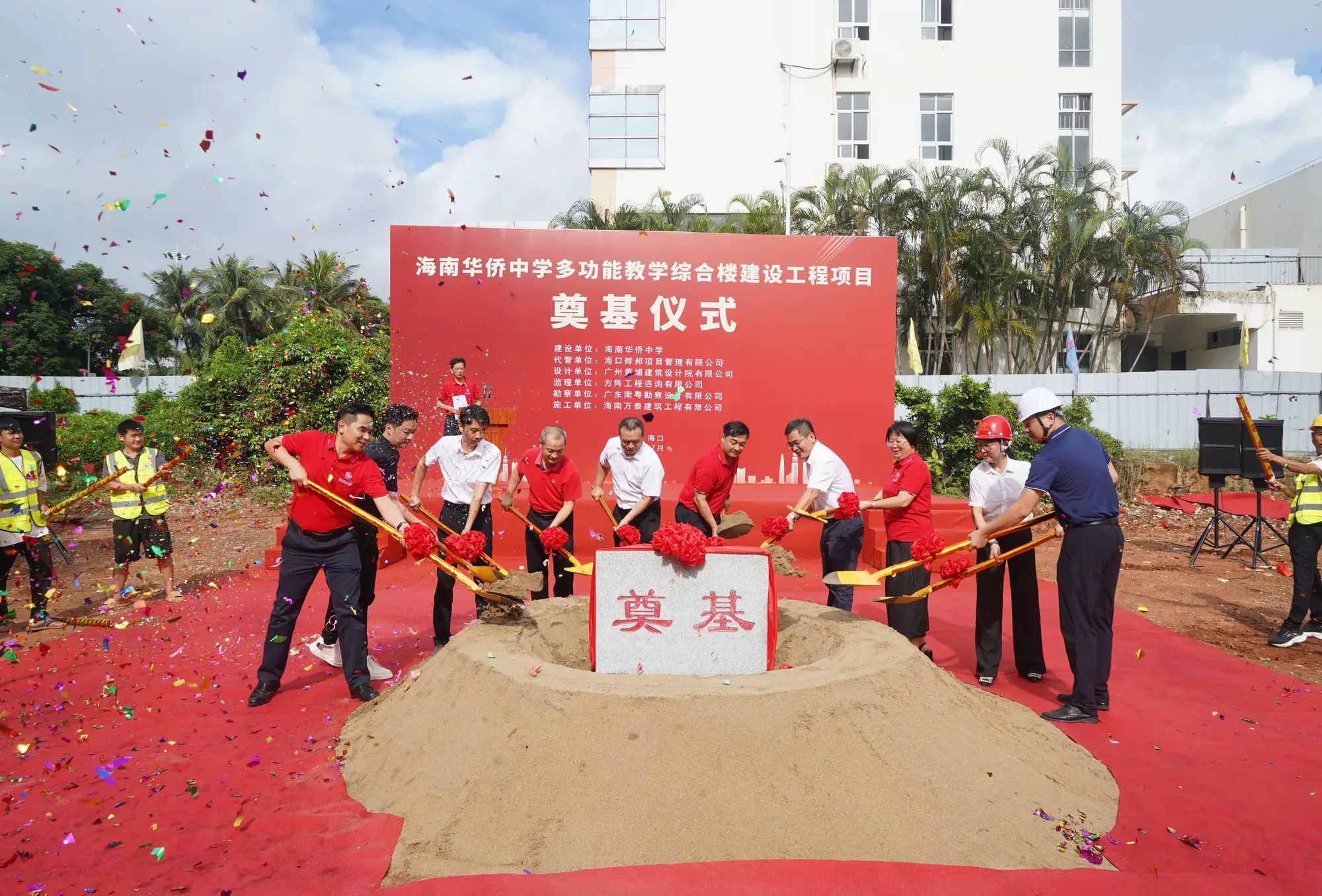 七月綠意爭(zhēng)相艷,書(shū)生意氣冠瓊州。7月19日,由海南萬(wàn)泰建筑工程有限公司承建的海南華僑中學(xué)多功能教學(xué)綜合樓建設(shè)工程項(xiàng)目舉行開(kāi)工儀式。海口市發(fā)改委黨組成員、副主任莊華東,海南華僑中學(xué)黨委副書(shū)記、校長(zhǎng)張偉,黨委委員、副校長(zhǎng)吳撼宇,??谑谐峭都瘓F(tuán)黨委副書(shū)記、董事、總經(jīng)理孫傳志以及代管、監(jiān)理、施工單位相關(guān)人員參加了本次活動(dòng)。儀式由海南華僑中學(xué)副校長(zhǎng)吳澤純主持。