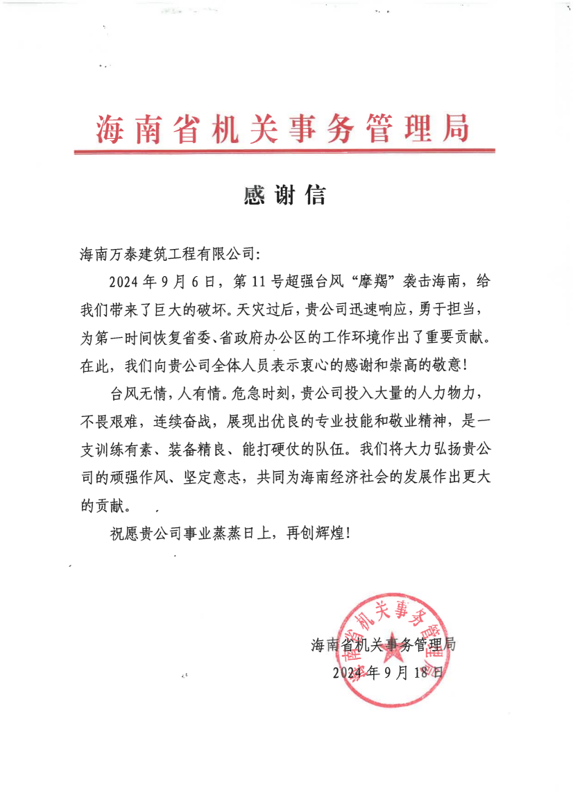 近日,海南萬泰建筑工程有限公司收到一封來自海南省機(jī)關(guān)事務(wù)管理局的感謝信。信中感謝了海南萬泰公司在臺(tái)風(fēng)剛過后,迅速響應(yīng),勇于擔(dān)當(dāng),組織力量投入超強(qiáng)臺(tái)風(fēng)“摩羯”災(zāi)后的道路清障工作,為第一時(shí)間恢復(fù)省委、省政府辦公區(qū)的工作環(huán)境作出了重要貢獻(xiàn)。