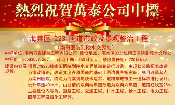 熱烈祝賀海南萬泰中標(biāo)海棠區(qū)223國道市政及景觀整治工程南田醫(yī)院到陵水交界處項目
