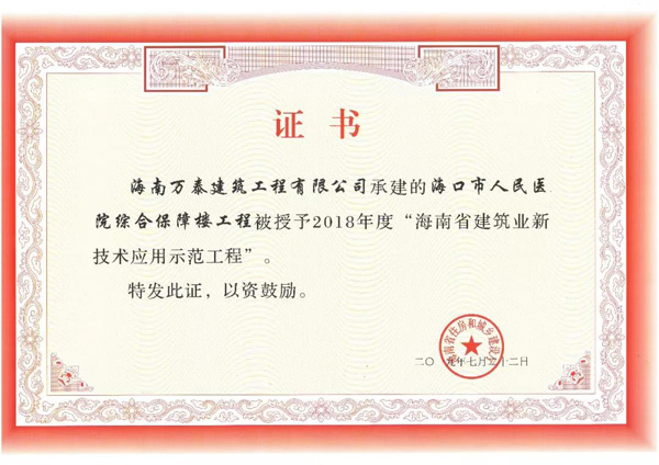 近期,海南省住房和城鄉(xiāng)建設(shè)廳下發(fā)了《關(guān)于公布2018年度海南省建筑業(yè)新技術(shù)應(yīng)用示范工程的通知》,由我司承建的海口市人民醫(yī)院綜合保障樓項(xiàng)目,獲評(píng)“2018年度海南省建筑業(yè)新技術(shù)應(yīng)用示范工程”。