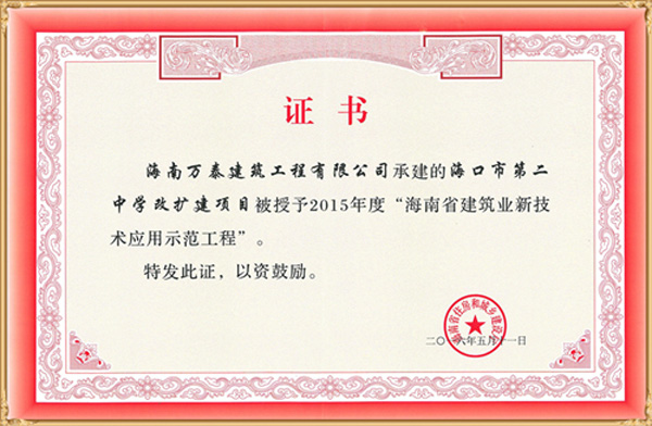 由海南萬泰建筑工程有限公司承建的“??谑械诙袑W(xué)改擴(kuò)建項(xiàng)目”被海南省住房和城鄉(xiāng)建設(shè)廳授予2015年度“海南省建筑業(yè)新技術(shù)應(yīng)用示范工程”。