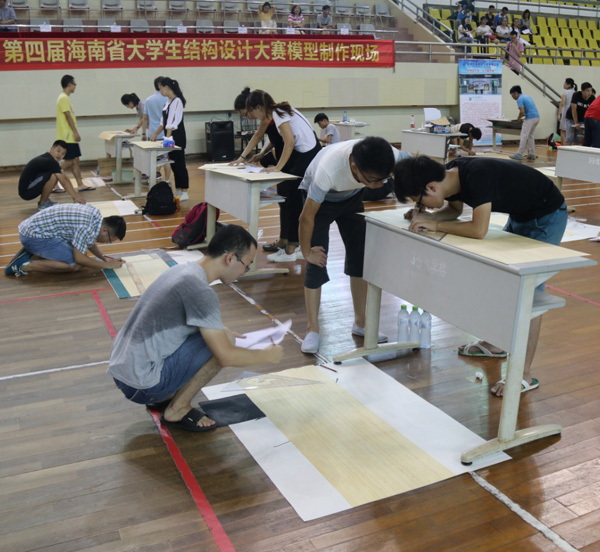 9點(diǎn)整,由海南大學(xué)校土木建筑系領(lǐng)導(dǎo)宣布比賽正式開始,同學(xué)們迫不及待的開始動(dòng)手制作模型。薄如紙片的竹皮要裁切成相等長(zhǎng)度和寬度的長(zhǎng)條,用502膠水粘成竹棍,作為塔架的主梁和柱子。不僅要承受的住幾十斤鐵塊的重壓,還要承受的住相當(dāng)于汶川地震級(jí)別的加載測(cè)試。選手們一個(gè)個(gè)信心滿滿,細(xì)心耐心加上專心。根據(jù)規(guī)則,比賽提供的膠水竹皮等材料如果不夠是不補(bǔ)發(fā)的,所以大家都小心翼翼,生怕出現(xiàn)意外。